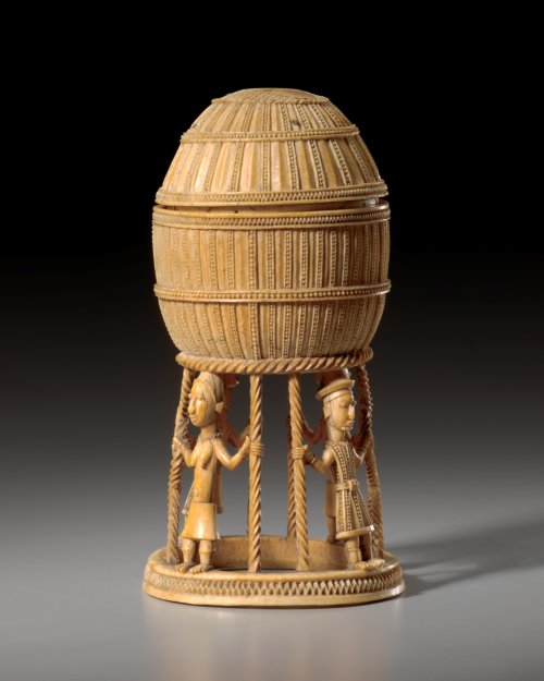 This intricately carved salt cellar with its beautifully rendered figures is one of the more important Sapi-Portuguese ivories. It is attributed to a workshop distinguished by salt cellars featuring cylindrical, openwork bases, and it is carved from one piece of ivory (excepting the lid). A luxury object, it would have been commissioned by Portuguese from local workshops, and incorporates an inventive combination of European and African design elements. The egg-shaped container is decorated with narrow beaded bands (a European embellishment) and supported by four standing figures (an African innovation).