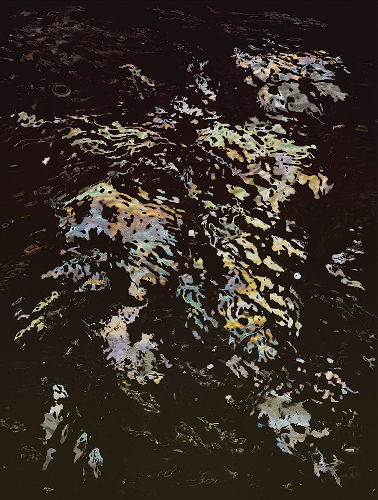 In spring of 2011, Gursky visited Bangkok and observed the Chao Phraya that flows through the city and empties into the Gulf of Thailand. In the Bangkok photographs, he depicts the flickering surface of the fast-flowing river at close range. The luminous ripples, captured in an expansive vertical format, echo the chromatic effects of Impressionism, or the bold compositions of the American postwar modernists. The river mutates endlessly, revealing a mercurial, iridescent pattern; a symmetrical, Rorschach-like image; or, as in Bangkok VI, a bright swath of turquoise, reflected from the plastic netting of construction scaffolding. This formal beauty, however, gives way to a toxic, scientific reality. Like urban waterways worldwide, Rome’s own Tiber included, the Chao Phraya is revealed by Gursky to be at once a dumping ground for all manner of manmade detritus (used condoms, mattresses, car tires); a crucible for natural disorder (dead fish and the pretty but devastating weed known as water hyacinth); and a reflecting, refracting mirror of the modern city in a constant state of flux.