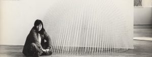 Miyamoto’s multi-layered, radical works defy simple categories and attributions: they find their starting point in Minimal Art yet go beyond its strict geometric abstraction. Her impressive string constructions—two- and three-dimensional works consisting of hundreds, sometimes thousands of nails and cotton threads—as well as her later works made of twisted paper ropes and painted kimonos convey a strong, corporeal presence in space despite their ephemeral character.