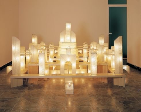 Garaicoa spends time exploring cities to discover their true meaning, he often illustrates his vision in large installations using various materials such as crystal, wax candles and rice-paper lamps. In No Way Out, 2002, a city at night is constructed through various scales of illuminated rice-paper lamps, while the materials in this work reference Japan, the uniformity of the city landscape alludes to a universal situation common to all cities worldwide. In The Crown Jewels, 2009, miniature replicas of real-life torture centres, prisons and intelligence networks are cast in silver and in Bend City (Red), 2007, a city is constructed entirely from cut cardboard.