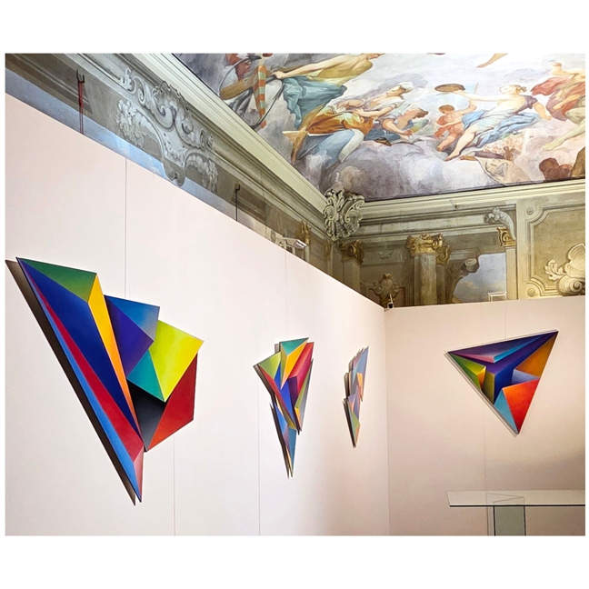 In Embroli’s shaped canvases and aluminium plates, colour and shade generate the illusion of depth and deceive the eye. The exhibition highlights a dialogue with the great pioneers of perceptual art, from Vasarely to Bridget Riley, and features the projection of the video from the historic exhibition The Responsive Eye (MoMA, 1965), filmed by a young Brian de Palma—a rare document that marked the consecration of Op Art, influencing fashion, design, and pop culture.