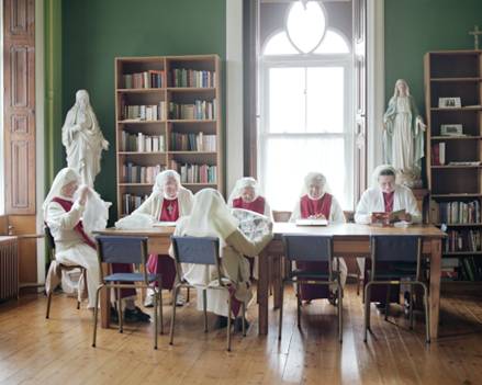 Also inspired by religious imagery Jackie Nickerson’s Green Room, 2005, is a compelling portrayal of a hidden world, the Catholic religious orders of Ireland. The work is part of a series of work by Nickerson entitled Faith. Her combination of gentle portraits and simple documentation of daily rituals and communal devotion suggest an austere existence grounded in optimism, strength and contentment. The simplicity of Nickerson’s images invokes the muted and restrained palette of Fra Angelico, bringing an often beatific air to her tranquil subjects. Whilst never suggesting that she is able to divine or represent the veiled mysteries of faith, Nickerson does manage to honestly present a vocational life driven by clarity of purpose and personal courage.