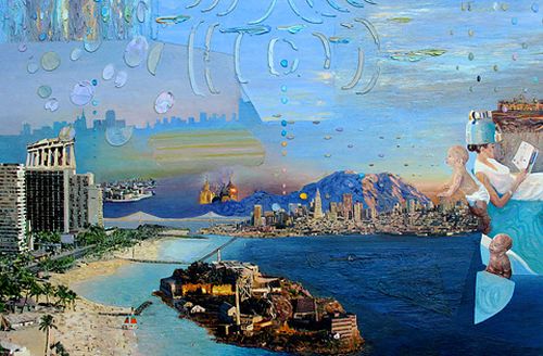 “Some of McNamara’s eye-popping obsessive-compulsive covers or coverlets include “Wise Ass”, a panoramic landscape reminiscent of Dali in its succulent palette and unfettered fantasy; “Encroachment”, a merger of two images of high-altitude maintenance workers in New York City and Dallas; “The Suitors”, depicting a Gothic Revival mansion and its upstart neighbor, a postmodernist work in progress “Unreal”, a montage of children, wounded soldiers and movie spectators with the epic quality of nineteen-century history painting, but without its canned sentiments; and “White on Color”, a large painting combining scores of images dealing with various types of “space” that have been edited with white paint and then preserved and muted by an overall glazing of white-tinted wax, resulting in a kind of artifact already dimmed and obscured by time. Social satire, surrealist fantasy and elegy vie with formal concerns in these works, but however ambiguous or enigmatic the narrative implications, the images are always compelling to viewers open to their eccentric seductions. With their surreal juxtapositions and cinematic jump cuts, they are, in the words of Gerrit Henry (Art in America), “ridiculous and sublime, all at once”-like real life.” DeWitt Cheng
