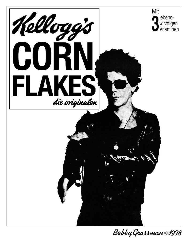 July 1975, I was enjoying my summer break from RISD – running wild in New York City. Then I came down with mono which left me camped out in bed for the summer listening to music, watching TV, reading and creating art. I clicked through channels for shows like Columbo, The Brady Bunch and Supermarket Sweep, and drank Coca Cola while browsing magazine favourites: Creem, Crawdaddy, Rock Scene, Interview and Rolling Stone. I read the recently published The Philosophy of Andy Warhol while playing the Lou Reed’s latest album Metal Machine Music. This is when I created my first Corn Flakes box collage. I appropriated a Mick Rock photograph of Lou Reed fashioning Vivienne Westwood for a paste up and my first pop art Kellogg’s Corn Flakes box. My friend David Pollack, an ace pop culture maven and Ovaltine jar collector stopped by, suggesting I continue the series with famous people on future Corn Flakes boxes. Shortly after, my friend Lib Mason in Hamburg wrote me a letter on the back of a German Corn Flakes box now creating – “Lou Reed Kellogg’s Corn Flakes Die Originalen.” A few years passed before my first photo shoot, bringing along a box of Corn Flakes, a favorite fruit, a carton of milk and a cereal bowl. In 1978, New York Rocker published eight of my Corn Flakes boxes as full pages over three issues. Looking back, I was just having fun with my friends.