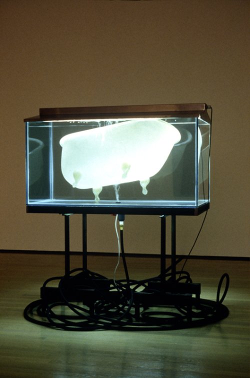 A shattering mirror in Le Tournis, 2008, by Gwenaël Bélanger (Québec), fanciful miniature worlds depicted in negative view in Les Petits Métiers, 1985, and Les Offrandes, 1986, by Philippe Favier (France), a table lavishly set with glass dishes and a glass chandelier in Les Hôtes and Le Grand veilleur, 2007, by Claudie Gagnon (Québec), a glass house in the film installation Home, 1986, by Wyn Geleynse (Ontario), a glass filing cabinet holding blank sheets of paper in Classifié, 1994, by Claude Hamelin (Québec), a neon work in Ciboulette, 1968, by Jacques Hurtubise (Québec), a glass table based on the Fibonacci numerical sequence in Tavolo, 1978, by Mario Merz (Italy), transparency and opacity of filiation in Mère obscure, père ambigu, fils accompli : Agathe, 1994, by Stephen Schofield (Québec), glass and neon sails in La Salle, 1980, by Keith Sonnier (United States) and a surrealistic sculpture of a bathtub in an aquarium in Silence and Slow Time, 1994, by Catherine Widgery (Québec).