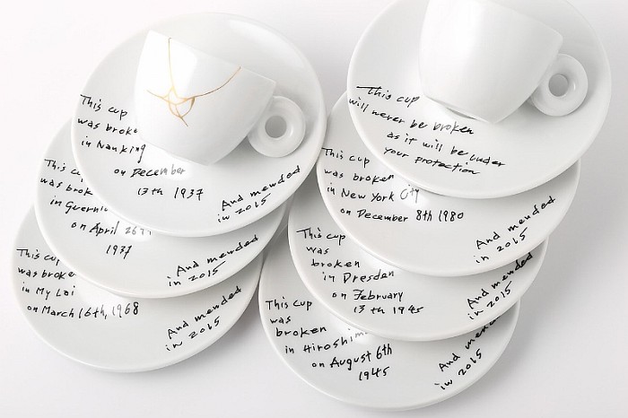 Yoko Ono: MENDED CUPS, an illy Art Collection, consists of six cups that bear gold, ‘shattered’ and ‘mended’ crack lines – accompanied by six individual saucers that state, in Yoko Ono’s handwriting, six catastrophic events that have affected the world; some have directly affected her life, and others only indirectly, yet bringing death to millions of people. Each saucer states the date and place of the tragic event and concludes with the words “… mended in 2015.” The seventh cup in the collection, UNBROKEN CUP, is untouched with no cracked or mended lines, reflecting peace and hope with Ono’s handwritten words on the saucer, “This cup will never be broken as it will be under your protection.” Since the early 1960s, Yoko Ono has had an impact on the international art scene, helping to redefine the relationship between the artist and society through her contributions to art, performance, music, feminism, and anti-war activism. It was this decade that fueled her 1966 work Mend Piece for her first solo show in London at the Indica Gallery, and an earlier work, Promise Piece (1961); in 1997, Ono created Crickets, a work of silence and void left by human destruction. For MENDED CUPS, Ono used the metaphor of the ancient Japanese art of Kintsugi, a technique of repairing broken or cracked pottery using brushstrokes of gold and silver, a philosophy that treats the breakage and repair as part of the object’s history–an important and precious detail, rather than something to disguise. “When I learned about the project that Yoko Ono had conceived for illy, a shiver ran down my spine,” said Carlo Bach, creative director for illycaffe. “When I view this illy Art Collection at once, I think about the fragility of our world, the possibility of forgiveness and the hope for a better future, which largely depends on our actions.” The Yoko Ono: Mended Cups-illy Art Collection will be available internationally at illycaffe stores and online via www.illy.com. During the early summer months of the exhibition, availability in the U.S. will be exclusively through The Museum of Modern Art (MoMA) Design Stores located at 11 and 44 West 53rd Street, and 81 Spring Street, as well as MoMAStore.org. The cup sets will have wider availability in the U.S. and Canada in September via www.illyusa.com, illycaffe shops, and the MoMA Design Store catalog.
